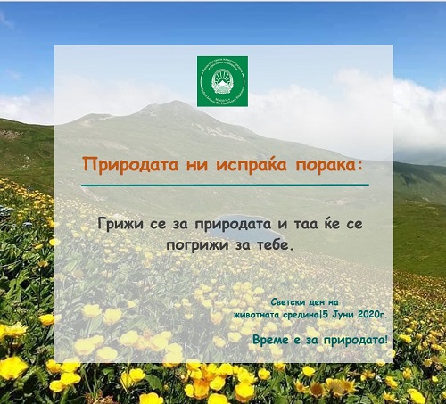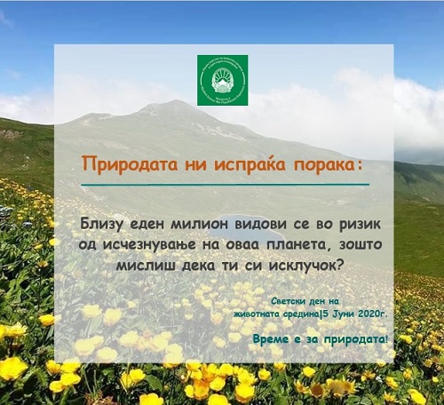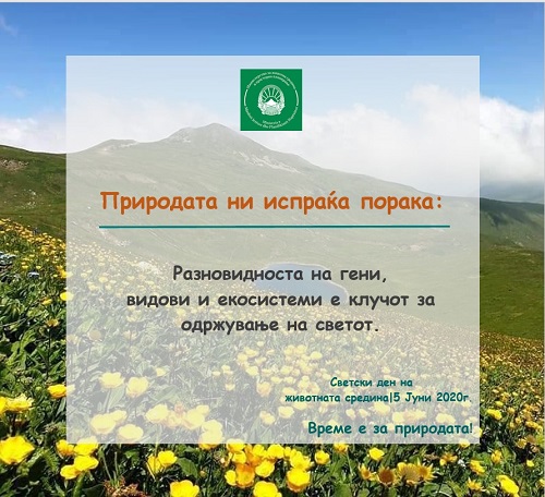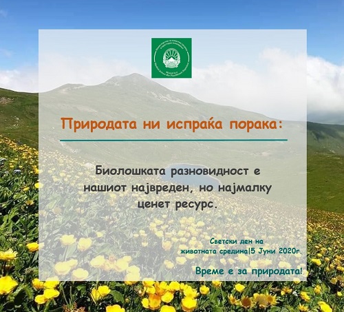5 Јуни е Светски ден на животната средина и оваа година меѓународната заедница го посвети на заштита на биолошката разновидност повикувајќи на акција против забрзаната загуба на видовите и деградацијата на природниот свет. Велиме, „Време е за природата“ бидејќи еден милион растителни и животински видови исчезнуваат, главно како резултат на човечки активности. Биолошката разновидност игра клучна улога во одржување на функционалноста на екосистемите со што се обезбедуваат конкретни добра и услуги од пресудно значење за човекот. Обезбедување здрава храна, вода, лекови и чист воздух се само некои од основните услуги, веројатно познати на секој човек, што ги добиваме од екосистемите. Самите процеси што се одвиваат во нив имаат благотворно дејство врз човекот – го штитат од поплави, ерозија, климатски промени. На крај, нешто непроценливо што му се нуди на човештвото, а не може да постои доколку нормалното функционирање на екосистемите е нарушено од какви било фактори, е можноста да уживаме и да се рекреираме во природата. Сите промени што влијаат врз биолошка разновидност, автоматски влијаат и врз функционалноста на екосистемите, а со тоа и врз човековата благосостојба.