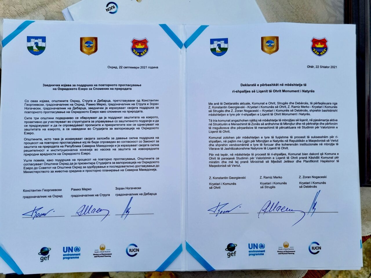 Со потпишување на заедничката изјава за поддршка на Студијата за валоризација на Охридското Езеро, градоначалниците на општините Охрид, Струга и Дебрца – Константин Георгиевски, Рамиз Мерко и Зоран Ногачески, ја потврдија подготвеноста да соработуваат во процесот на репрогласување на Охридското Езеро за Споменик на природата.