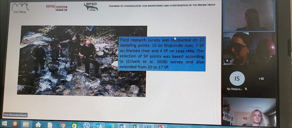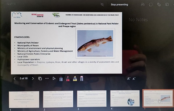 Заменик министерката за животна средина и просторно плaнирање Христина Оџаклиеска денеска ја отвори онлајн обуката за мониторинг и конзервација на преспанската пастрмка, што се реализира во рамките на проектот: “Мониторинг и конзервација на ендемската и загрозена пастрмка (Salmo peristericus) во Националниот Парк Пелистер и Преспанскиот регион”. Проектот е финансиран од PONT (Prespa Ohrid Natuture Trust) и CEPF (Critical Ecosystem Partnership Fund), а имплементатор е Балканска Фондација за Одржлив Развој (БФОР).