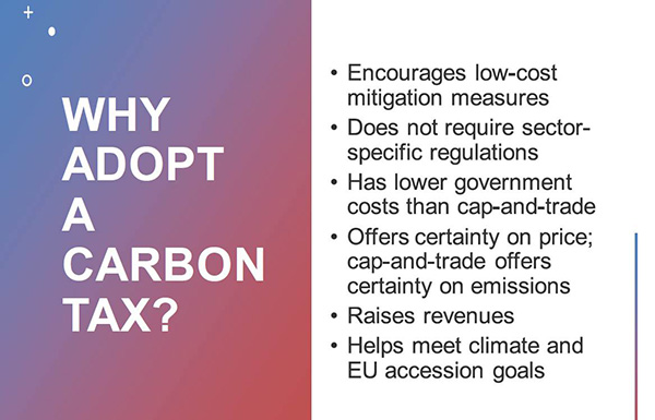 Воведувањето данок на јаглерод може да има најголемо вкупно влијание врз намалувањето на емисиите на стакленички гасови во нашата држава. Воведување на данок на јаглерод во согласност со постоечките вредности на ваков данок во ЕУ, би ги намалило емисиите на стакленички гасови во нашата држава скоро на половина и би ја поддржало трансформацијата на енергетскиот сектор.